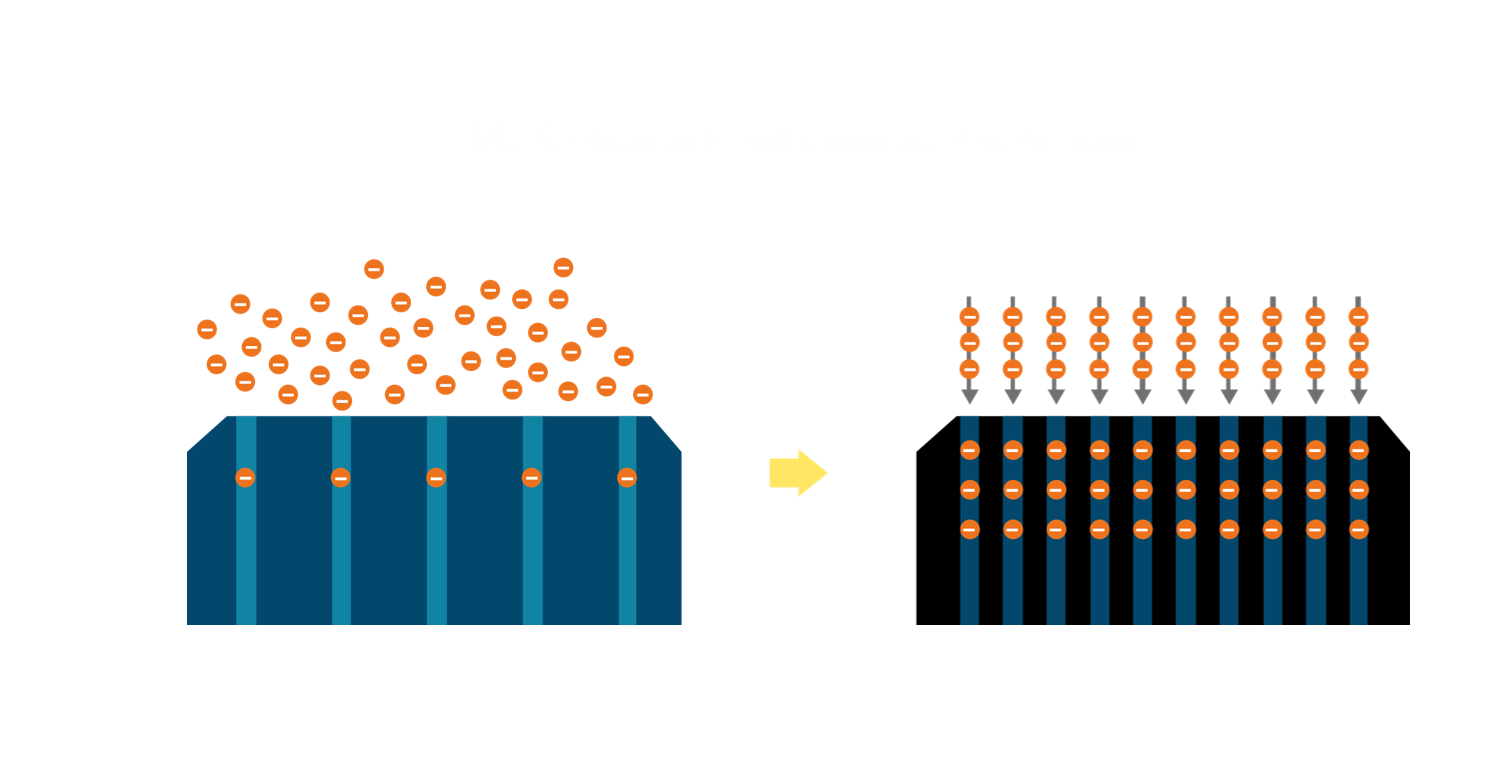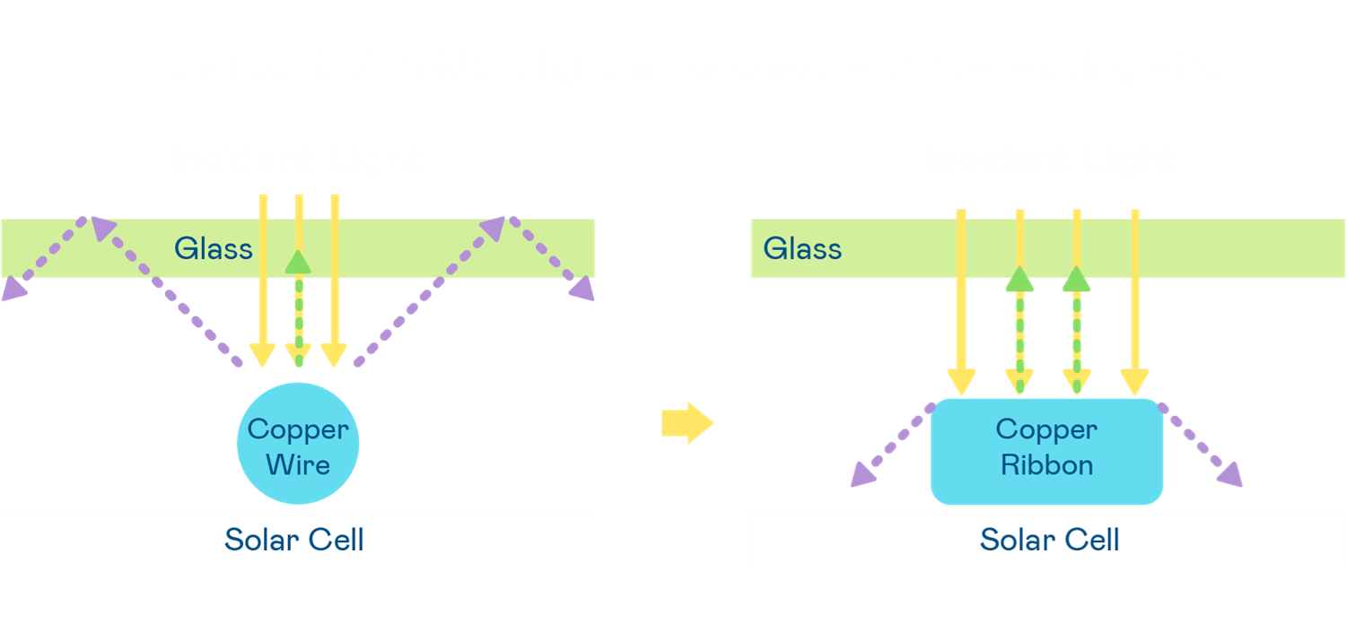 • 電池使用多條銅導(dǎo)線 (Copper wire) 于電池片上形成較短的電流路徑,提高電流收集效率,采用圓形設(shè)計的銅導(dǎo)線較傳統(tǒng)扁平式的銅焊帶 (Ribbon),可增加入射至電池的光線量。